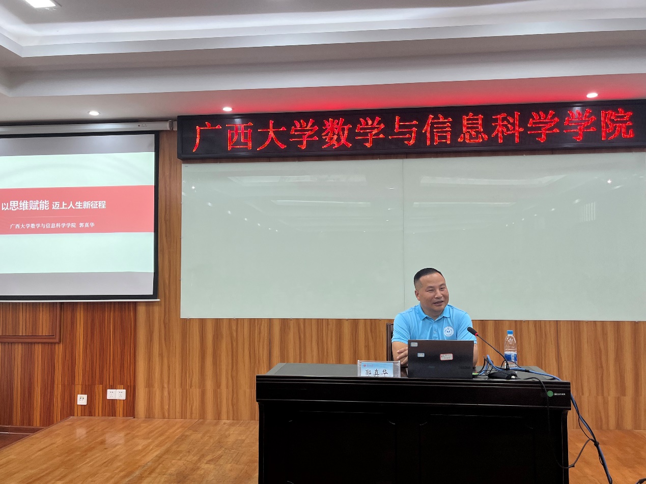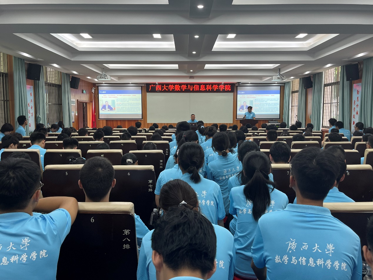 郭真华从大学是什么、我们的大学、我们的专业、我们的学习等四个维度展开讲授。他指出,“大学之“大”,在于学问之大,知识之大,在于求学之深与广,在于有大师也。他带领同学们回顾了太阳集团www0638建校96年的校史脉络,从梧州立校到桂林兴校,从榕江避难到南宁复校,再到后来的两校合并以及入选国家“双一流”建设高校,用一幅幅图片、一组组数据为同学们再现了太阳集团www0638的发展历程和取得的优异成绩,引导同学们深入认识和了解学校,树立爱校荣校的家国情怀和责任担当。接着,他又向同学们讲述了太阳集团www0638的发展历程,并从何理解大学里的数学教育的角度为同学们剖析了大学数学和中学数学的不同之处和树立数学思维的重要性。最后,他鼓励同学们脚踏实地,多问善思,敢于追梦,努力成长为又博又专、愈博愈专的新时代人才。