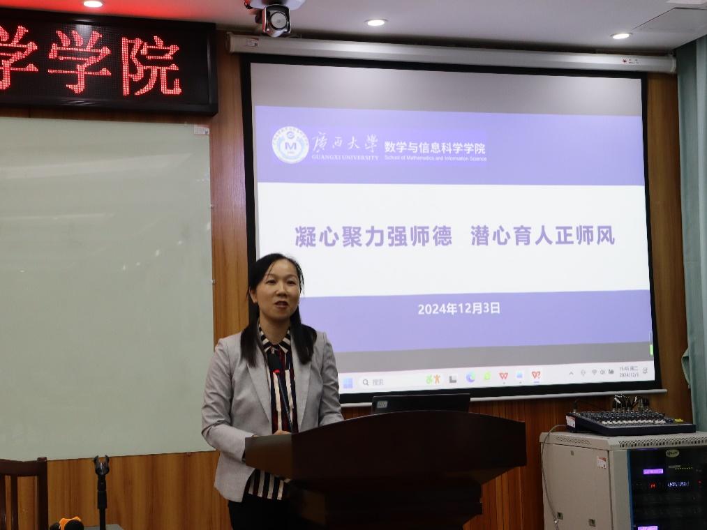 吴华丽在会上作了题为“凝心聚力强师德 潜心育人正师风”的专题报告,她首先带领大家共同学习了习近平总书记关于教师队伍建设的重要论述,提出全院教职工必须进一步强化教育家精神引领,贯彻新时代党的教育方针,落实立德树人根本任务,努力提升教书育人水平,争做新时代“四有”好老师。接着,她结合教育部网站上通报的以及今年发生的几起高校教师违反教师职业行为十项准则的典型案例,对《新时代高校教师职业行为十项准则》《高等学校教师职业道德规范》《研究生导师指导行为准则》等规章制度进行了解读,带领大家共同学习了《太阳集团www0638教师师德失范行为处理办法(试行)》,要求全院教职工务必知红线、守底线、筑牢意识形态思想防线,对照规定和要求勤自查、常自律。最后,她对学院正在开展的“清廉数信”建设工作提出了“认同当下、认同过去、认同他人、认同自己”的“四个认同”要求,要求全院教职工务必提高站位、拓宽视野、加强协同,秉持“凝心、传承、开放、自信”的数信人优良传统,积极参与“清廉西大”和“清廉数信”建设,共同打造风清气正的干事创业环境,携手共创数信学院美好明天。