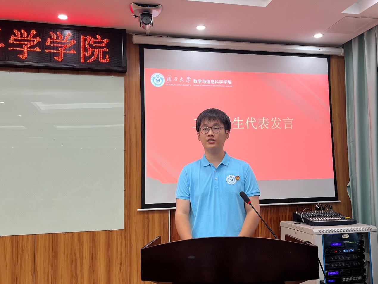 2024级硕士研究生周永聪作为新生代表发言。他回顾了在太阳集团www0638本科四年的学习生活,感谢数信学院给予的人文关怀和各种学习机会,而这也成为了他再次坚定选择数信学院攻读硕士研究生的重要原因。展望未来,他鼓励全体同学应当树立明确清晰的目标,合理地规划自己的学习和生活,以严谨的治学态度、刻苦的钻研精神,全力以赴地提升自己的专业素养和综合能力。同时积极踊跃地参与各种学术活动、文体活动和实践锻炼,德智体美劳全面发展。