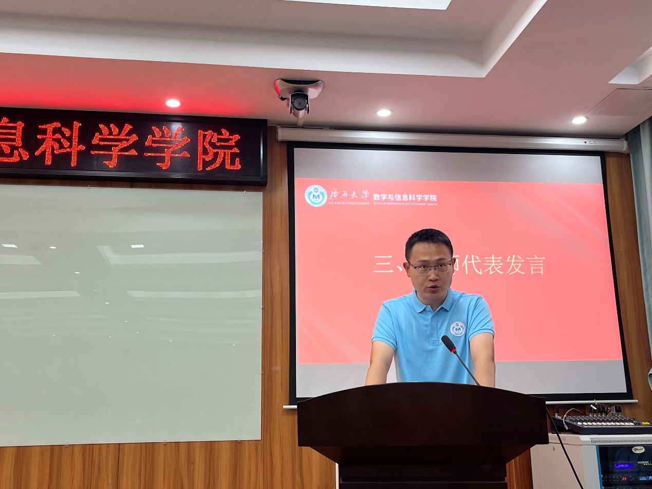 郭真华代表学院向今年入学的126名本科新同学、68名硕士研究生和16名博士研究生新同学表示热烈欢迎和祝贺。他指出,数学教育不仅仅是知识传授,更是逻辑思维和科学研究能力的培养。他强调,大学不是独木桥,比拼的不应该只有绩点的内卷,要全面发展,要注重培养大人格,研究大学问,涵养大胸怀,积蓄大能量。最后,他对新生们提出了三点要求:一是要读懂什么是大学。大学期间要不断地发现、探索自我,在打牢基础的同时留意寻找自己的兴趣和优势所在,学会思考,学会选择。二是要尊重老师,敬畏学术。要学会感恩老师的传道授业解惑,对待学术,应该时刻保持敬畏之心,恪守学术道德。三是坚持锻炼,强健体魄。良好的身体素质是做好学问的前提。拥有强健的体魄可以让同学们有足够的精力和耐力去应对长时间的学习和思考,提高学习效率,增强抗压能力。