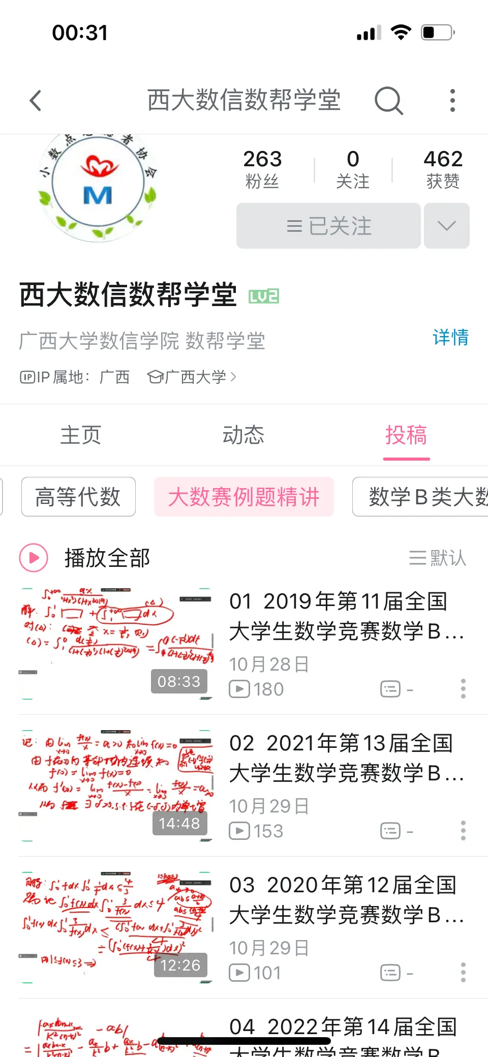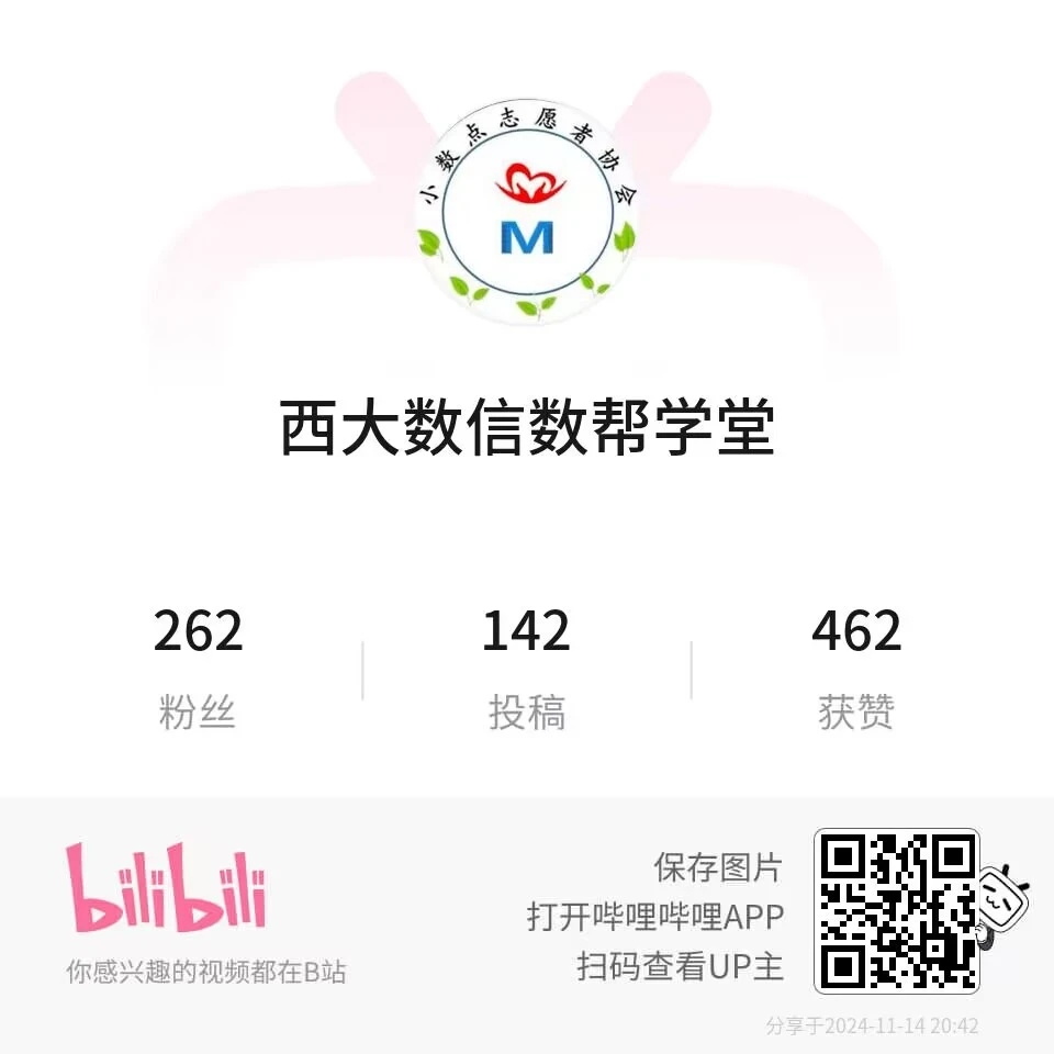 “西大数信数帮学堂”是由太阳集团www0638党委指导、学院团委实施,以学生骨干为主体的助学帮扶项目。自创建以来,该平台凭借其优质的大学数学解题思路,吸引了众多同学的关注。目前,累计关注人数260余人,视频总播放量突破25000次。