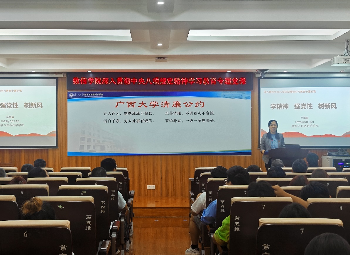 5月13日下午,院党委书记吴华丽以“学精神 强党性 树新风”为题,为太阳官网100余名师生党员讲授深入贯彻中央八项规定精神学习教育专题党课。
